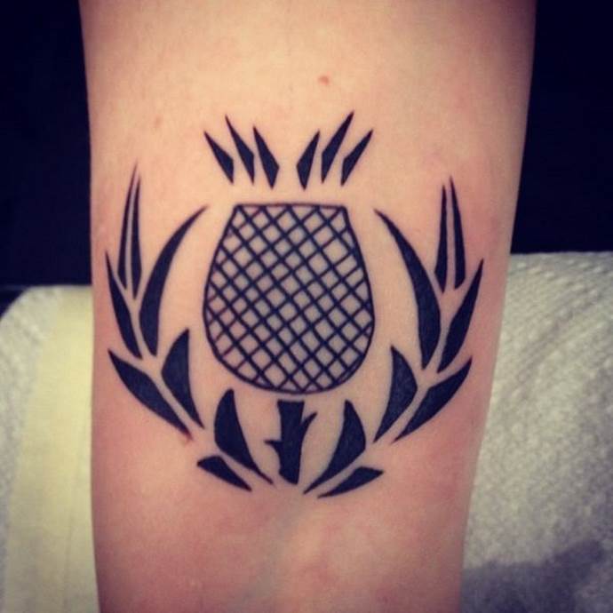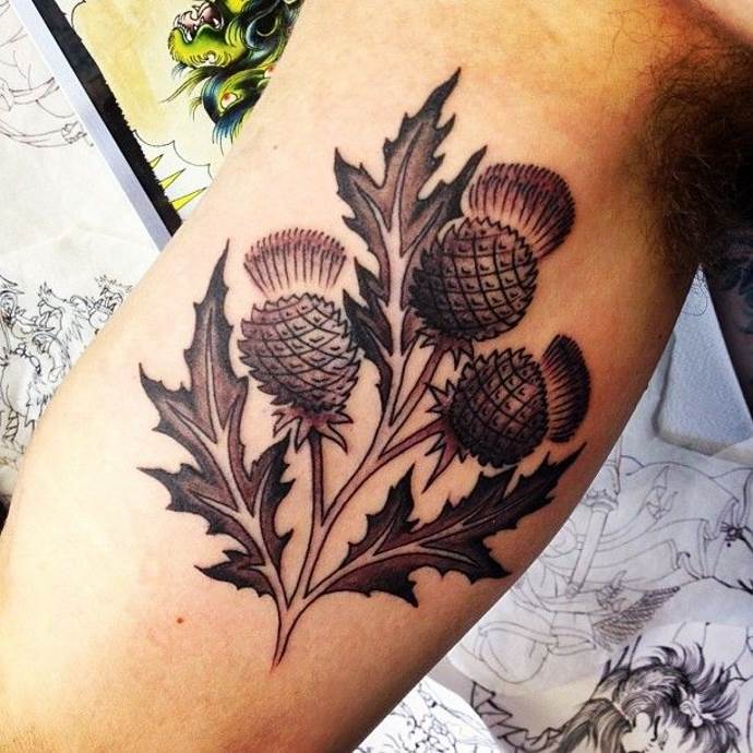 Le tatouage de chardon audacieux convient mieux aux hommes au caractère bien trempé. Un tel dessin soulignera les priorités pour un membre du sexe fort. Cela lui indiquera que le contenu intérieur est beaucoup plus important pour lui que l'enveloppe extérieure.