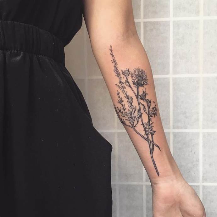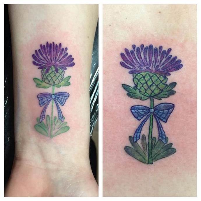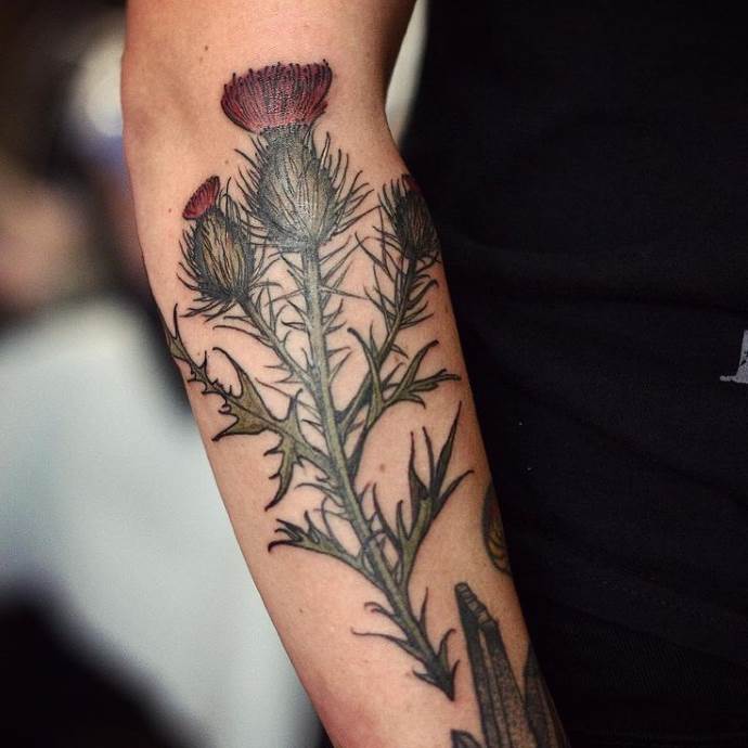 Le tatouage de chardon est beau et sophistiqué dans les versions monochromes et colorées. La combinaison de pétales violets et de verdure, les lignes pures et la silhouette épurée sont visuellement très réussies.
