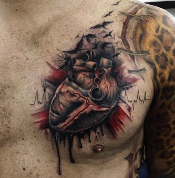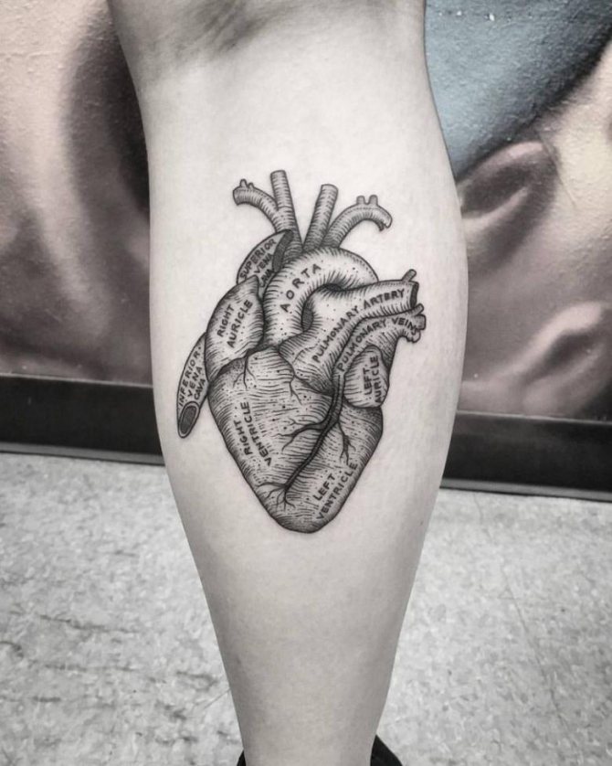 Le cœur anatomique symbolise l'amour, mais il est moins romantique et plus profond. C'est une connexion entre les âmes. La couleur du tatouage reflète la nature de la relation. Plus la nuance est proche du rouge, plus l'interprétation du tatouage est positive.