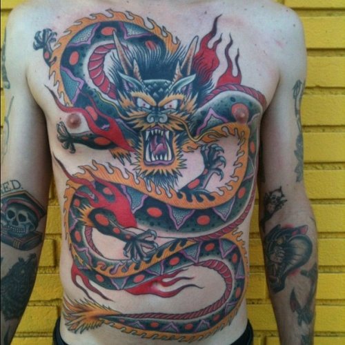 On pense que le tatouage de dragon protège son propriétaire des mauvaises influences, l'aide à affirmer sa position de leader dans l'équipe et l'aide à réaliser ses rêves. Le lézard à ailes rouges aidera son propriétaire à devenir réussies .. Un serpent d'or perché sur l'épaule apportera la richesse.