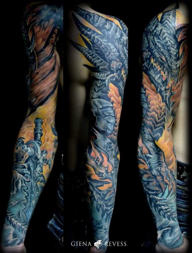 Le tatouage d'un reptile avec des ailes sur le bras d'un homme en dit long. Il n'est pas rare que les adeptes des religions orientales et des arts martiaux ornent leurs mains de dragons. Les lianes volantes "aident" les jeunes hommes pour rester sur la voie qu'ils ont choisie et atteindre leurs objectifs.