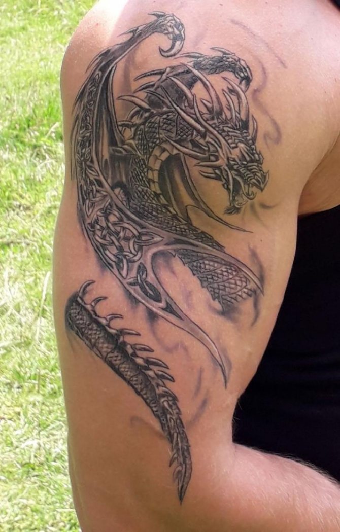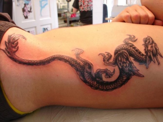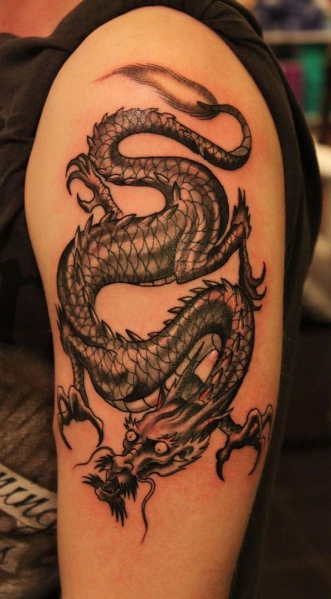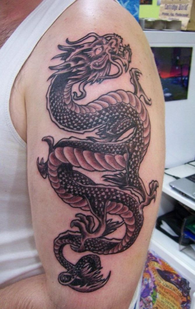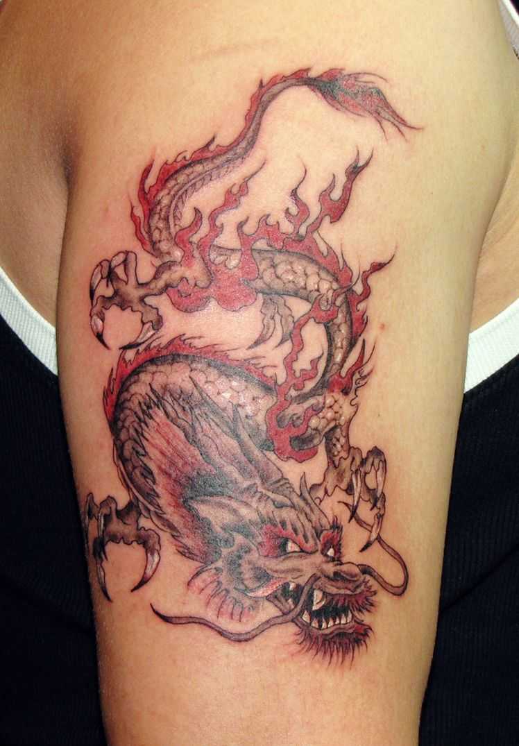 Image d'un monstre mythique sur cette partie du corps Plus souvent choisi par les hommes. Les filles, si et le dragon farci tatouage sur l'épaule, sous la forme d'une petite image. Et les gars font du tatouage, en commençant par l'avant-bras et en allant vers la poitrine ou l'omoplate.
