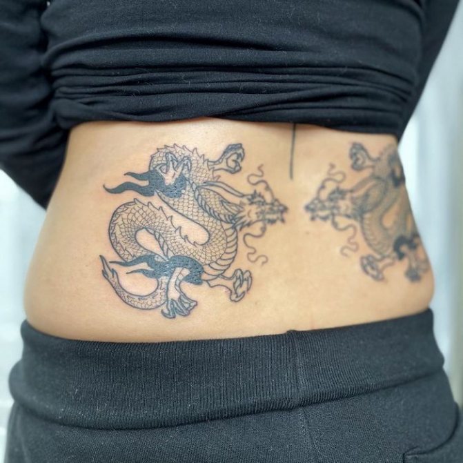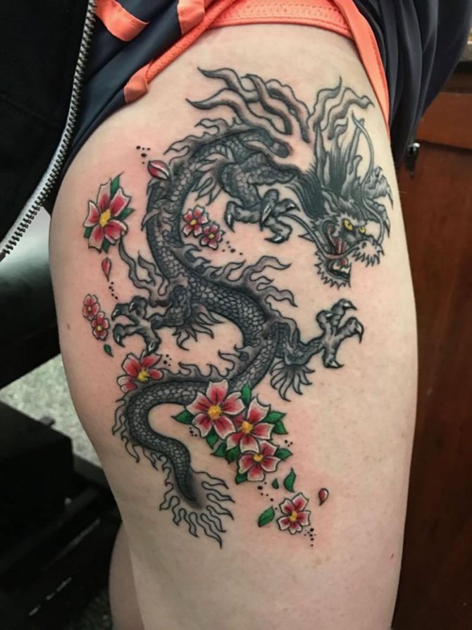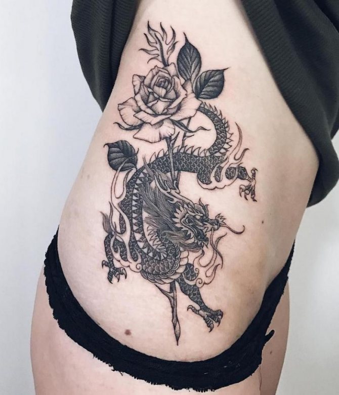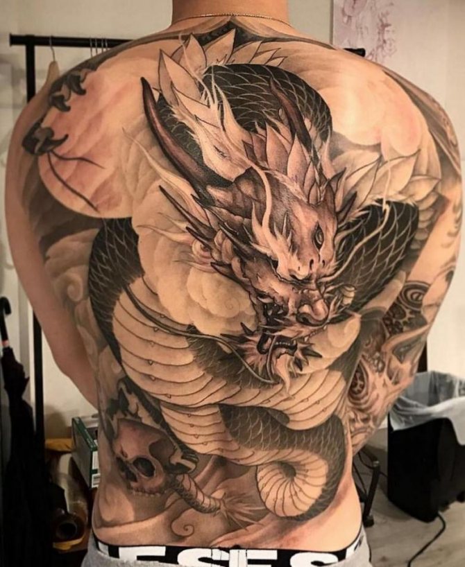 Ce n'est pas seulement un dragon, c'est une composition entière. une composition entière, une image d'histoire. Il n'est pas rare de voir un tatouage représentant un lézard ailé combattant un tigre. La victoire du cerf-volant sur le prédateur signifie la victoire du bien sur les forces obscures.
