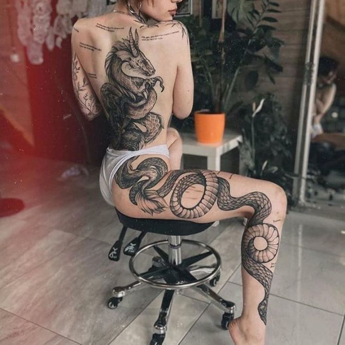 Les tatouages de dragon chinois pour les filles (style oriental) présentent un certain nombre d'avantages : ils ressemblent à des serpents capables de s'emmêler dans la zone de tatouage désignée (bras et jambes) ou de se regrouper dans une zone plate (dos ou côtes).
