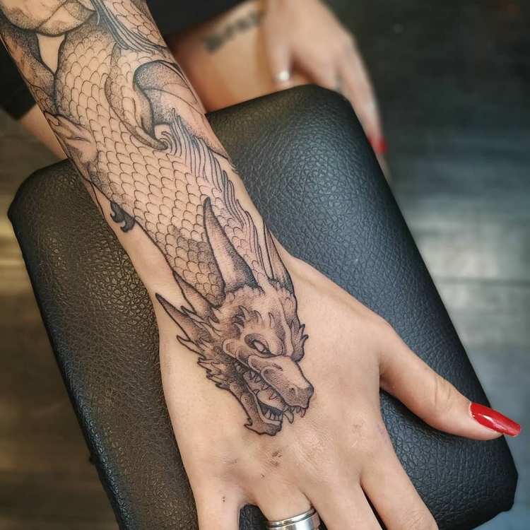 L'image de la liane ailée est souvent privilégiée par les hommes. Ils sont attirés par les grands dessins colorés qui couvrent la totalité de la main. Les filles se font souvent tatouer le lézard comme un bijou exotique sans raison. Mais pas toujours. La célèbre actrice А. Jolie a tatoué un dragon sur son avant-bras gauche pour montrer la puissance de son instinct maternel.