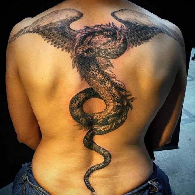 Le tatouage est joli aussi bien en une seule couleur qu'en plusieurs couleurs. Un serpent ailé à la bouche ouverte et au rictus, glissant vers le bas, symbolise l'hostilité, le courage et la détermination à attaquer à tout moment. En règle générale, ces jeunes hommes n'affrontent pas les premiers, n'attaquent pas eux-mêmesMais cela ne leur servira à rien de se mêler de leurs affaires, de voler leurs biens ou de les obliger à se soumettre aux opinions des autres.