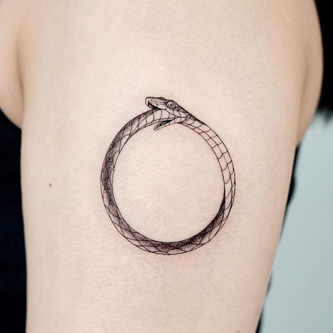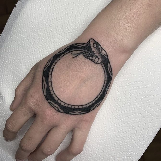Le tatouage d'un serpent se mordant la queue est un ancien symbole d'éternité. L'Ouroboros signifie la nature cyclique de la vie et de la mort, l'infinité de l'univers. Ce tatouage convient aussi bien aux hommes qu'aux filles. On attribue à l'anneau Ouroboros des propriétés magiques en tant que talisman. Une personne qui choisit cette image ancienne doit savoir qu'en plus de refléter la négativité de l'extérieur, ce symbole fermé est capable d'amplifier la négativité interne, détruisant ainsi celui qui le porte.