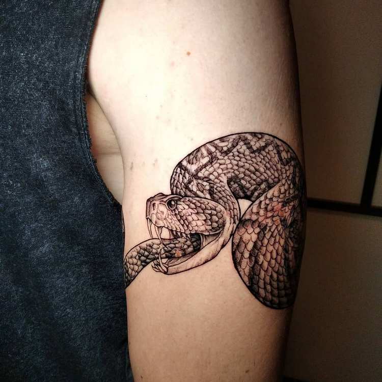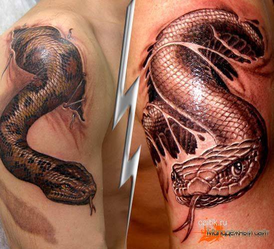 Tatouage de reptile au look impressionnant sur l'épaule, la poitrine, l'avant-bras, lorsque la tête du serpent perce la peau et semble sortir du corps. Il est également possible de capturer un prédateur enroulé dans des anneaux.