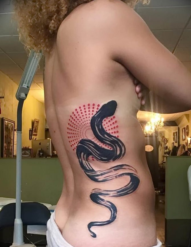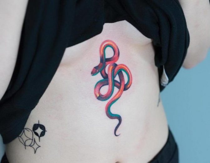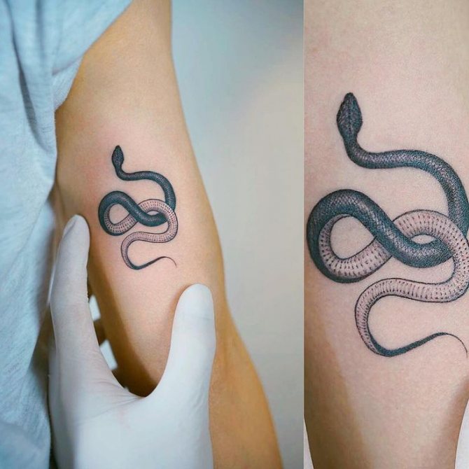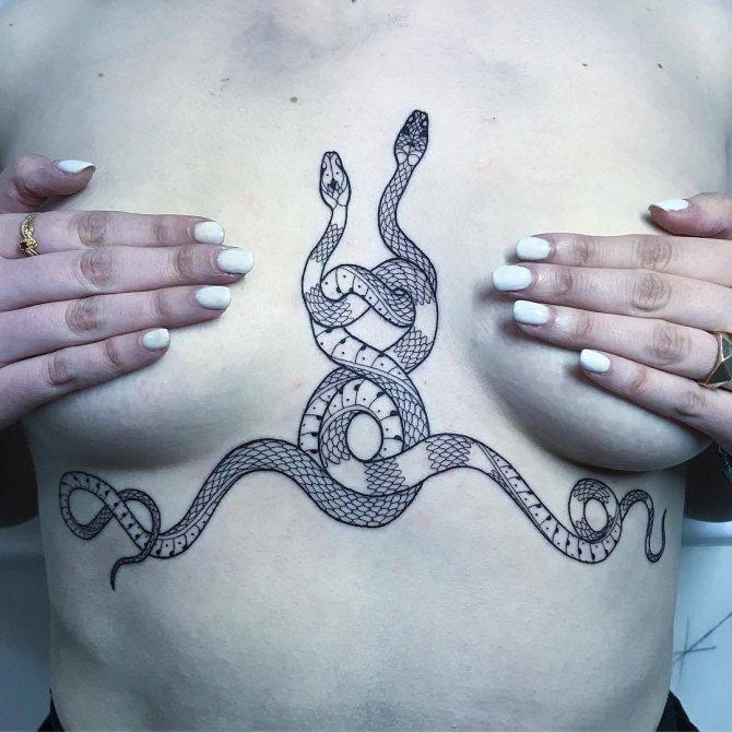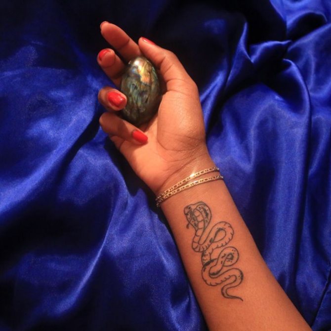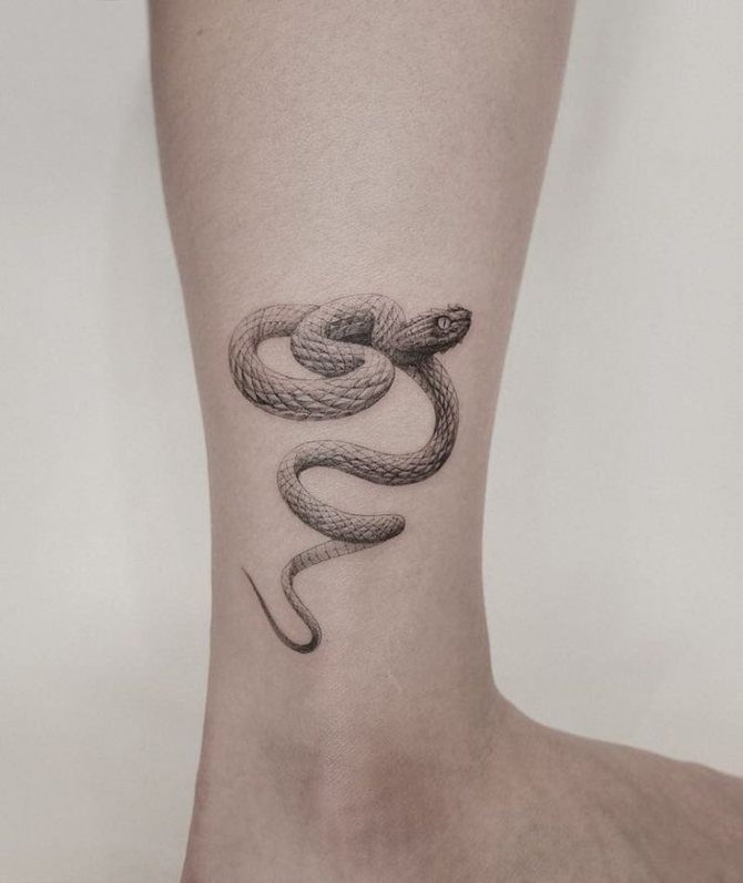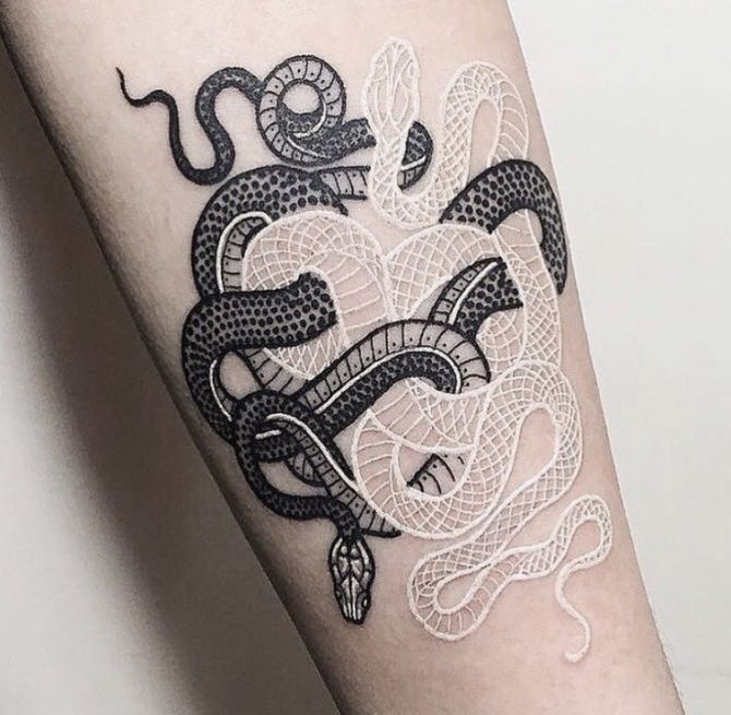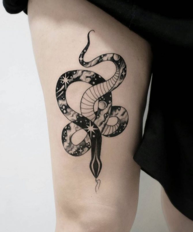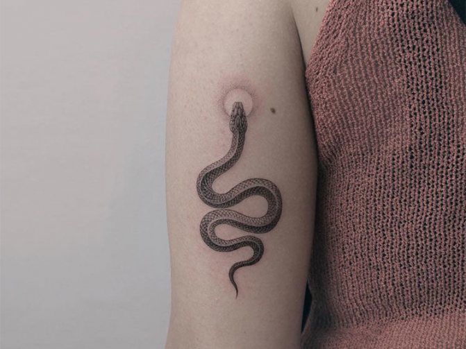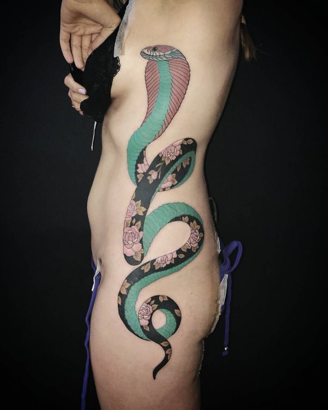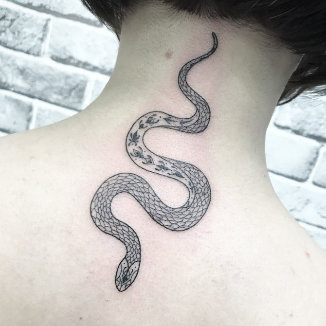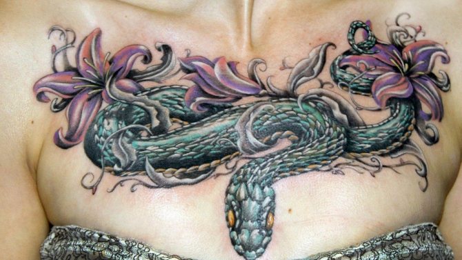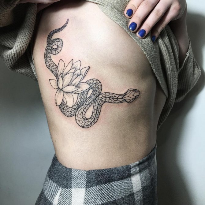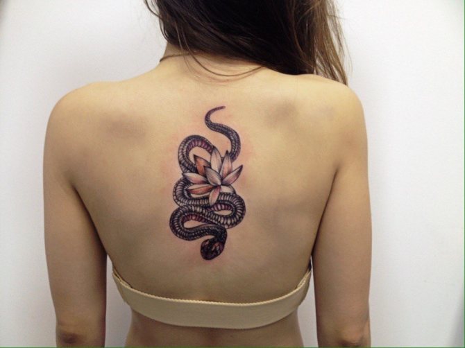 Le tatouage de serpent (dont la signification pour les filles dépend de l'apparence de l'animal) peut être réalisé en combinaison avec différents objets, qui donnent une signification supplémentaire à la parcelle.
