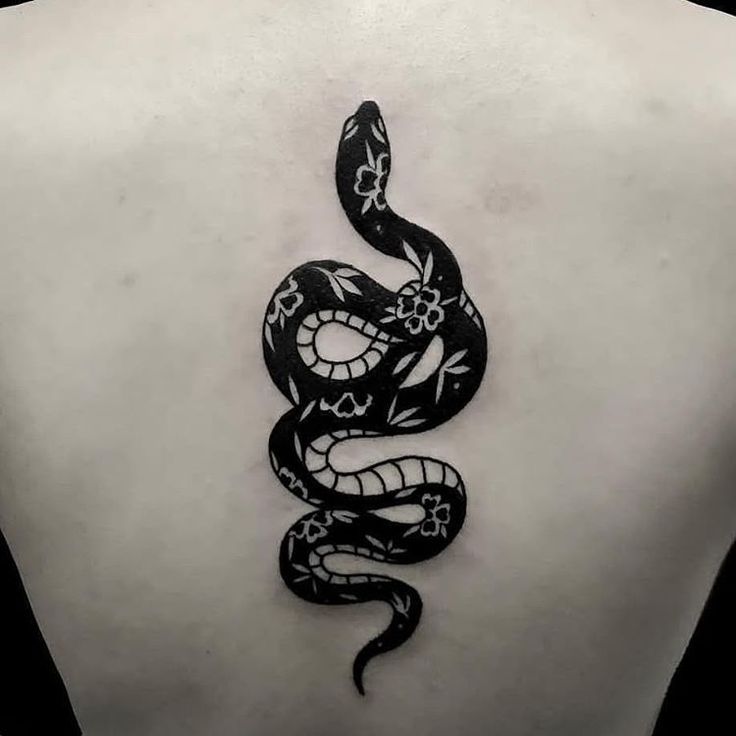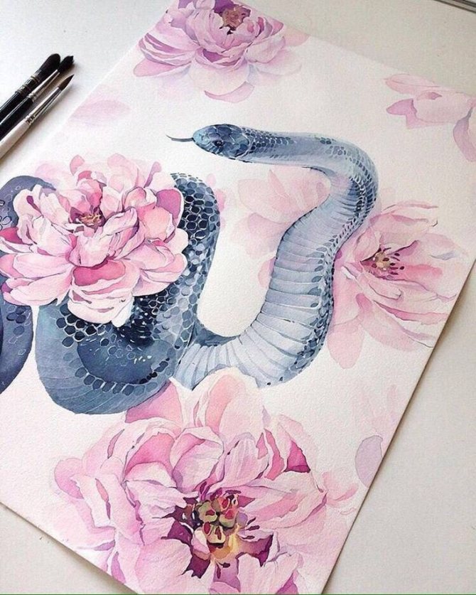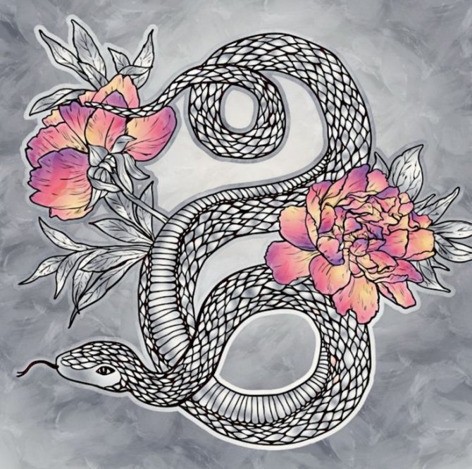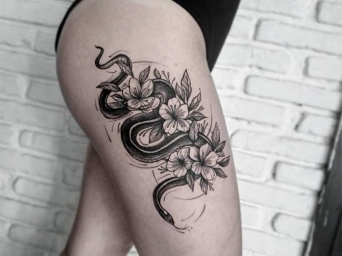 À côté des fragiles bourgeons et pétales, le serpent devient l'incarnation de la grâce, de la sagesse. Dans un tel tatouage, le reptile à sang froid révèle ses qualités positives.