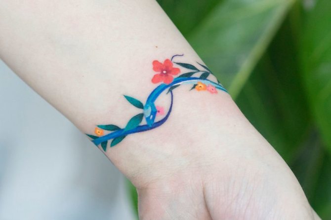 Les images avec des fleurs sont souvent choisies par les filles et appliquées sur les zones exposées du corps. Ces dessins sont pleins de couleurs et très émouvants. En même temps, on peut aussi trouver des tatouages monochromes. Elles expriment le sex-appeal, le charme, la féminité et l'imprévisibilité. Le tatouage peut être un serpent rampant parmi les fleurs ou un animal dont le corps s'enroule autour d'un bouquet éclatant. Dans les compositions, outre les bourgeons, on utilise également du feuillage et des éléments supplémentaires sous la forme de pierres précieuses et d'objets d'art.