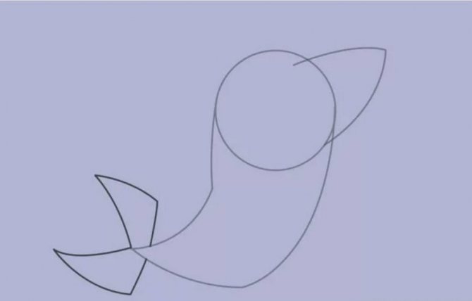 - Utiliser la ligne courbe pour tracer la mâchoire inférieure, se plier en arrière sous le rictus et s'arrêter au niveau sous l'œil le plus proche (partie inférieure du corps). À l'extrémité, dessinez une queue pointant, comme le museau, vers l'avant. Depuis la queue, dessinez un grand arc vers l'œil le plus éloigné (dos et tête). Séparez la tête et le dos avec un aileron.