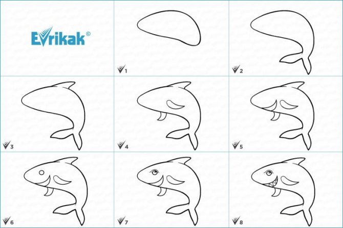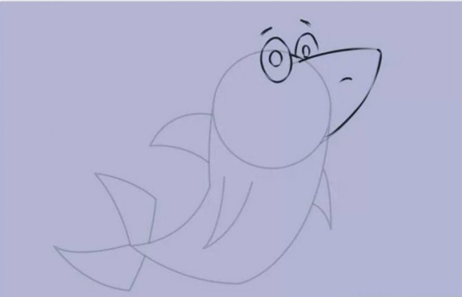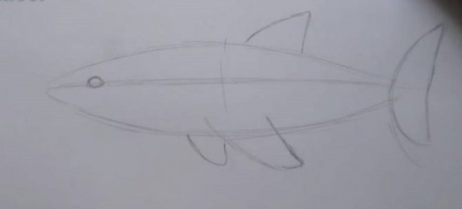 - Dessinez les nageoires inférieures : positionnez la plus éloignée de la lèvre inférieure, la plus proche du gésier, avec les branchies au-dessus du gésier en tirets. Divisez la partie dorsale du corps et le ventre en arc de cercle.