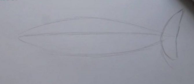 - Depuis le coin supérieur droit de la feuille, tracez un long arc vers le coin inférieur gauche. Au bout, formez une queue de poisson. De là, dessinez une ligne presque droite dans la direction opposée, représentant le dos.
