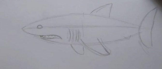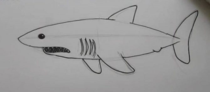 - Travaillez sur l'ensemble du requin, ajoutez des détails sous forme de lignes sur le corps représentant les branchies, et ajoutez des dents.