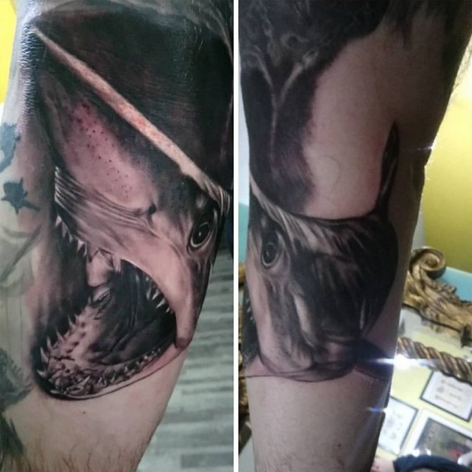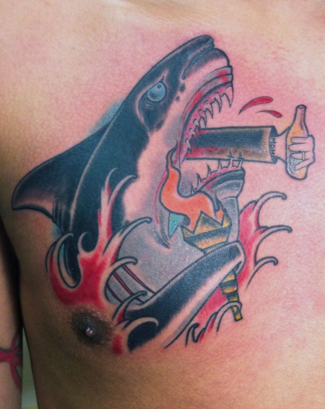 Malgré la polyvalence du tatouage de requin, il ne faut pas faire un choix hâtif du motif, car tout dessin corporel n'est pas seulement une démonstration de certaines qualités et traits de caractère du propriétaire. Il s'agit avant tout de votre monde intérieur, de ce que l'on appelle le second moi. Un requin serait un excellent compagnon pour une personne sûre d'elle et qui persévère dans la direction de son objectif, mais il serait complètement hors de propos sur le corps d'un romantique timide.