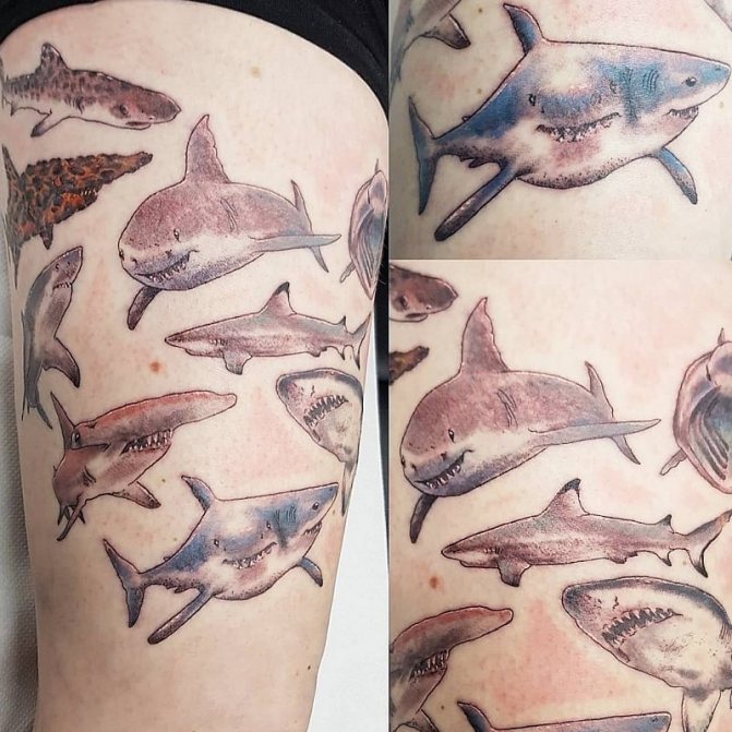 Après avoir analysé de nombreuses photos de travaux finis et de croquis, nous pouvons conclure que les croquis avec des requins sont très diversifiés. En fonction de votre attitude envers cette créature et de ce que vous allez finir par souligner ou démontrer, tous les tatouages peuvent être divisés en plusieurs catégories. Il s'agit d'abord des dessins "menaçants", qui représentent le prédateur au moment de l'attaque. La bouche ouverte avec d'horribles dents pointues fait partie intégrante d'un tel dessin. Viennent ensuite des images de l'animal calme, montrant la beauté naturelle et la puissance du requin. La touche finale est un joli petit dessin de style cartoon qui ne manquera pas d'humour, comme une canne et un chapeau haut de forme sur la tête d'un prédateur. Le tatouage de requin-marteau est également populaire. Dans tous les croquis, l'image principale du prédateur peut être complétée par un arrière-plan de haute mer, un navire, une boussole, des vagues déferlantes, un plongeur nageant au loin ou une image du dieu de la mer Neptune.