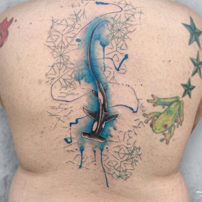 Ce type de requin n'est pas seulement l'un des poissons les plus anciens, mais il a aussi l'apparence la plus bizarre, un tempérament plus féroce et de l'agressivité. C'est pourquoi nous avons décidé de parler séparément du tatouage avec ce type de requin. Cette espèce a une forme de tête inhabituelle, ressemblant à un outil du même nom, ce qui, à un niveau subconscient, l'associe davantage aux mystères sous-marins des mers et des océans, remontant à un passé lointain. En outre, le requin-marteau est réputé pour son incroyable capacité à traquer ses proies et pour la ruse dont il fait preuve pendant la chasse. Sur cette base, les croquis représentant cette espèce de requin peuvent servir à la fois de talisman et de symbole de toutes les significations susmentionnées, auxquelles s'ajoute la ruse.