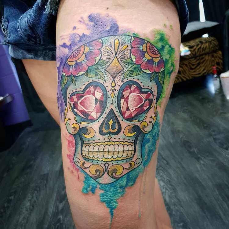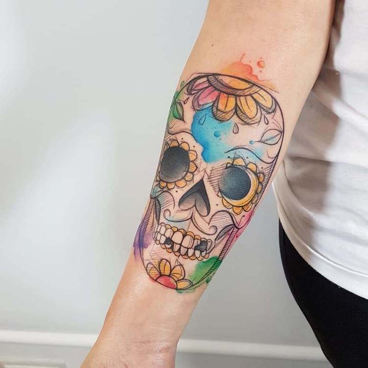 - Un crâne aux couleurs vives, de style ancien. Ce type de tatouage n'est pas souvent vu dans le milieu de l'art corporel. Considérez donc cela comme une occasion de vous démarquer de la monotonie des tatouages monochromes.