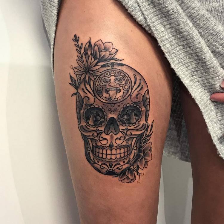 Néanmoins, les hommes et les femmes ont adopté la culture mexicaine et ont appliqué le crâne fleuri et à motifs sur leur corps. Aussi croquis de tatouage crâne populaire avec diverses cellules de la société, tels que les goths et les motards, comme l'un des principaux attributs de la direction de leur philosophie intérieure de style.