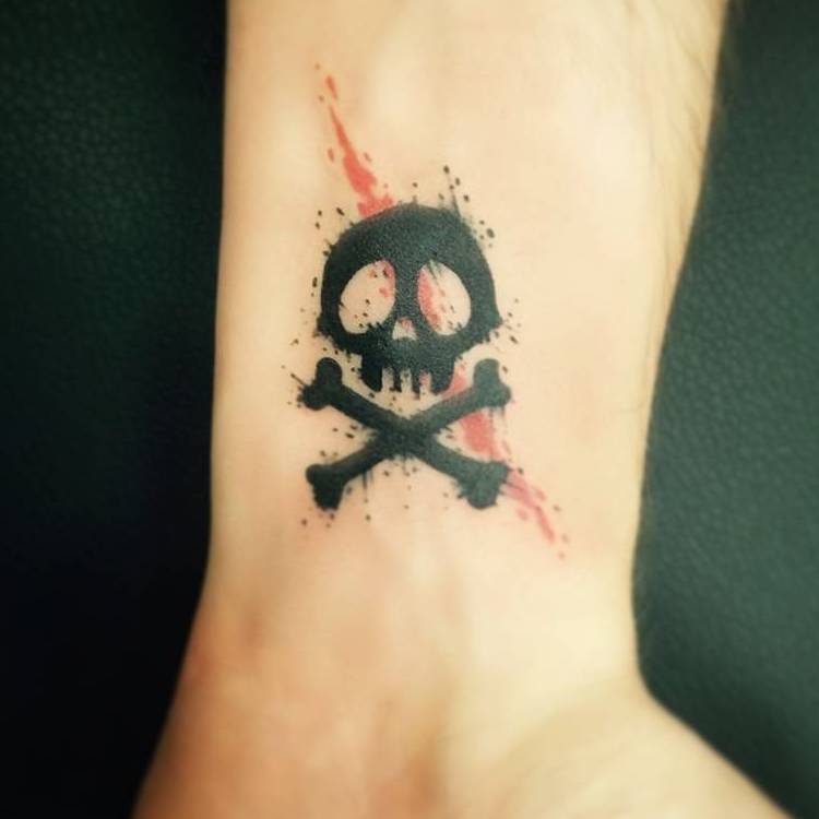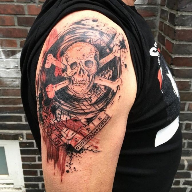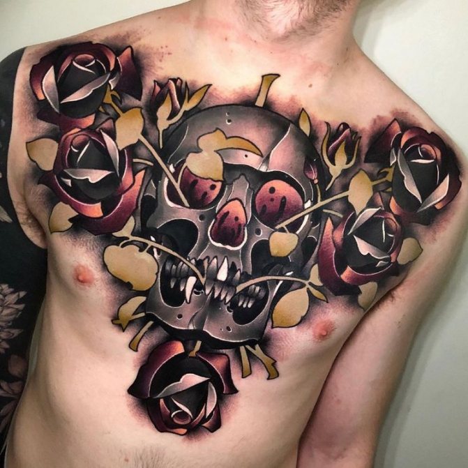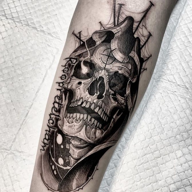 Mais le rappel de la mort n'est pas la seule interprétation de ce symbole. Certaines cultures considèrent le crâne comme une amulette personnelle. En outre, l'image du crâne souligne la masculinité et l'intrépidité de son propriétaire. Ces tatouages sont souvent de nature militante et menaçante. Il ne serait pas superflu de mentionner le fait que le crâne est également un symbole de destruction et de mort. Le symbole est également un symbole de destruction et de mort, non sans raison, les pirates et les criminels l'ont activement utilisé et continuent de l'utiliser. Une tête de mort sur le corps semble dire "ne te mets pas en travers de mon chemin".