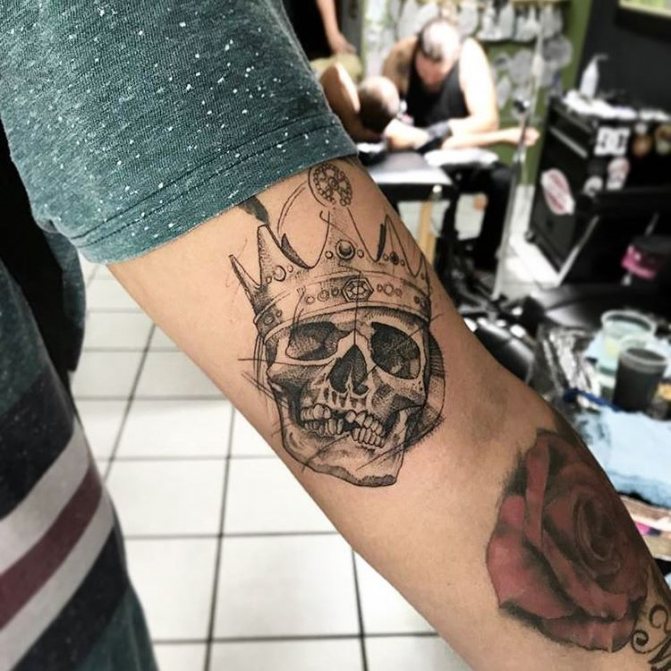 Il est important de savoir que dans les cercles criminels, le crâne symbolise un rang élevé de voleur, il convient donc de choisir soigneusement le dessin de votre tatouage. Sinon, vous risquez de vous retrouver dans une situation délicate où vous devrez confirmer votre autorité non pas par une image corporelle, mais par une action et une volonté réelles.