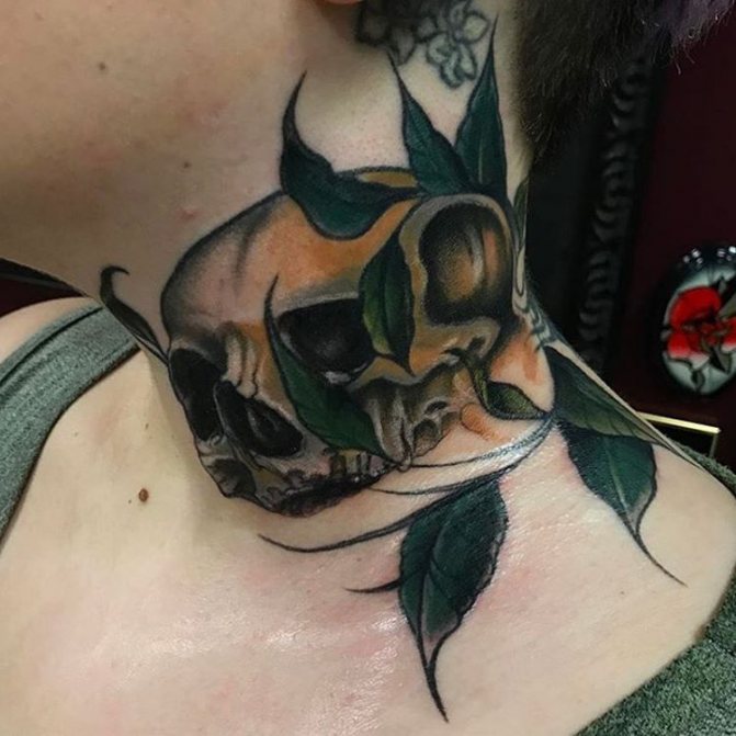 Souvent, une telle image est imprimée sur l'épaule. Dans le cas d'une image de grande taille et la présence de plusieurs symboles dans sa composition est plus pratique est l'emplacement sur le dos. Un crâne, de forme allongée, couvert de fleurs et de plantes, est une esquisse féminine typique. Les endroits les plus appropriés pour l'appliquer sont les pieds, les mains et les tibias.