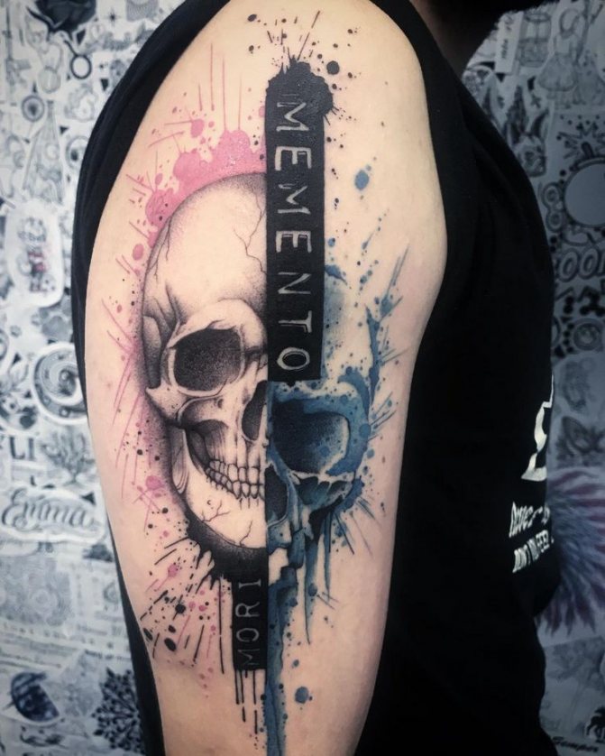 - Un crâne avec une inscription sacrée. Le choix de l'inscription dépend du concept du tatouage et des convictions personnelles de l'auteur.