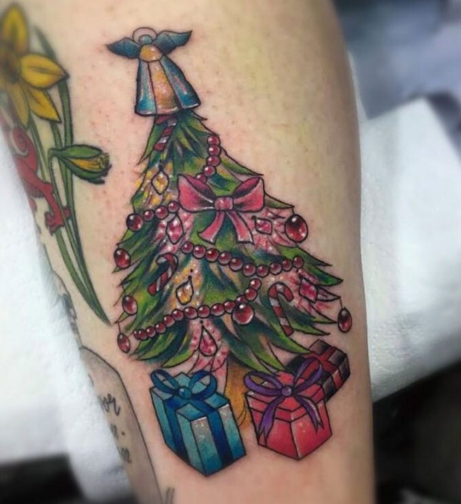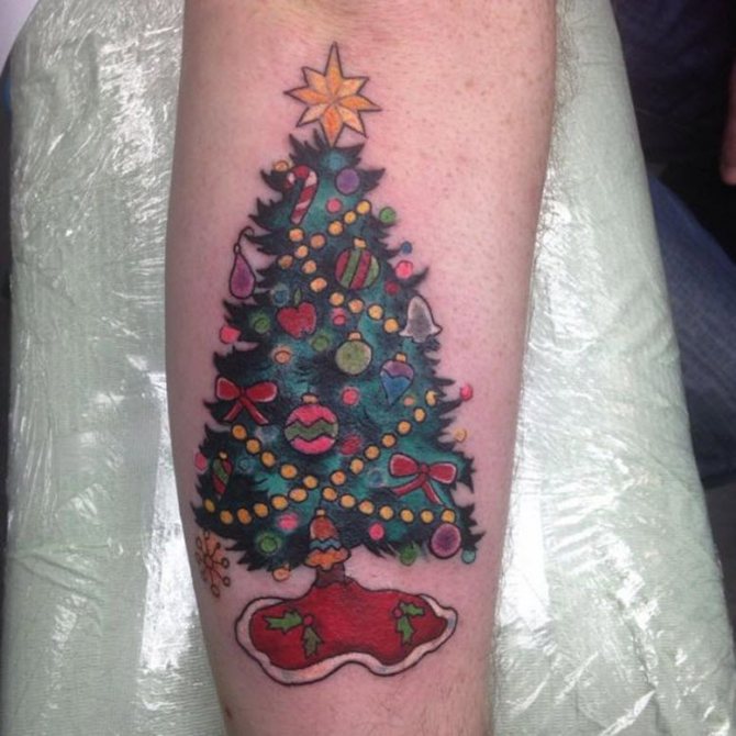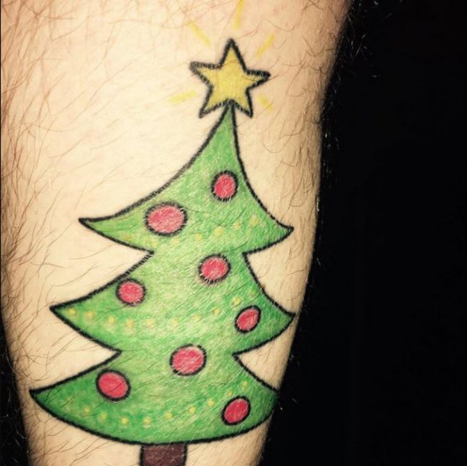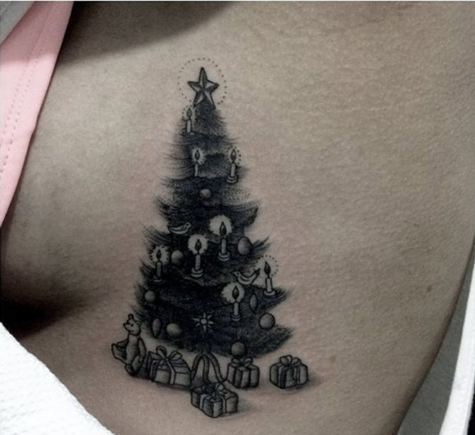 Le tatouage avec l'image d'un arbre à feuilles persistantes est plus beau dans une couleur noire monochrome. Quant au choix du style, la meilleure option sera le minimalisme, grâce auquel le tatouage sera petit et laconique, tandis que les détails supplémentaires ne détourneront pas l'attention de l'arbre. Si le body art doit être lumineux et festif, vous pouvez décorer l'arbre avec des jouets et des guirlandes, en réalisant le dessin dans le style new skool ou old skool.
