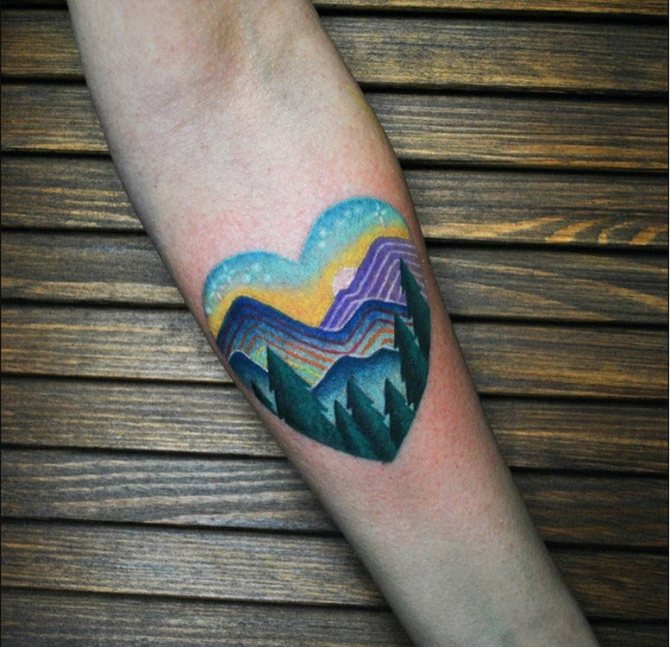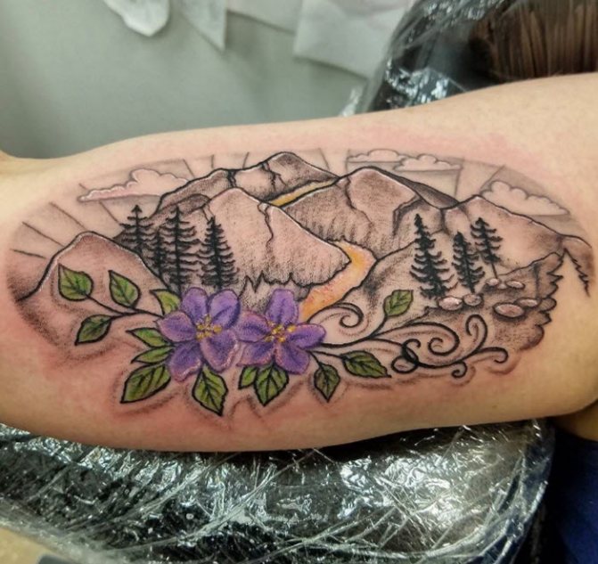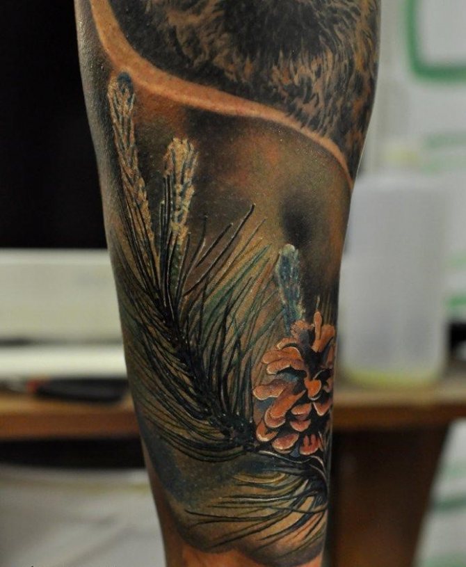 Il est intéressant de noter que les dessins colorés ont un aspect plus positif, plus gai et plus amusant. Un tatouage d'arbre peut être autonome ou faire partie d'un motif plus large réparti sur le corps. Les paysages où l'épicéa est entouré de rivières, de lacs, de montagnes ou d'autres arbres sont très populaires. Un tatouage de style réaliste sera la solution parfaite pour les filles sûres d'elles et peut être agrémenté de fleurs (une reproduction exacte de la couleur de l'original sur le corps). Une attention particulière est accordée aux branches et aux cônes lors du dessin du croquis. L'endroit idéal pour ce tatouage est le biceps ou l'avant-bras.
