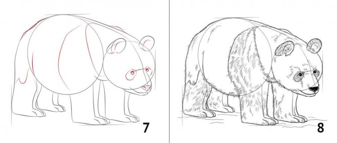 Aux endroits nécessaires, nous ajoutons des reliefs - nous dessinons des scapulae et des protubérances d'os, nous marquons également des taches de panda (si vous voulez dessiner un ours en peluche, vous n'avez pas besoin de dessiner des taches).