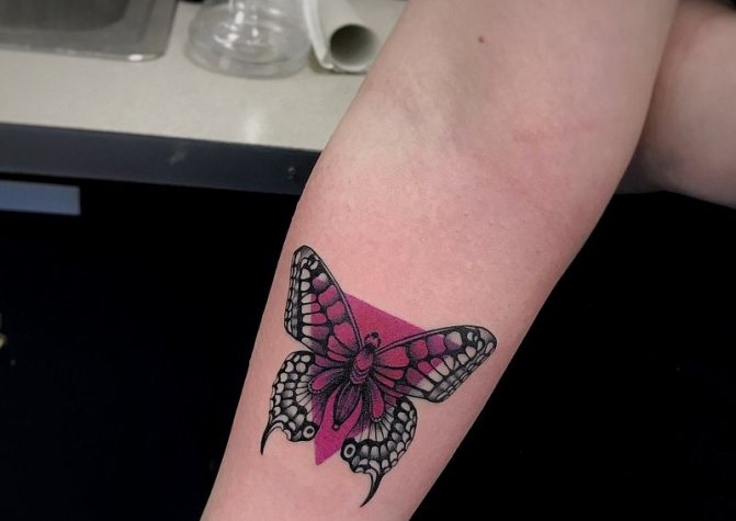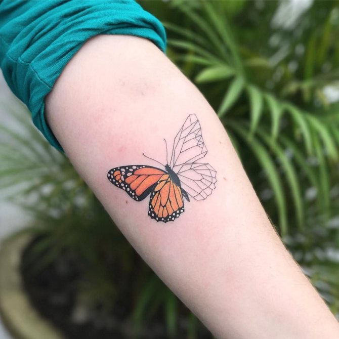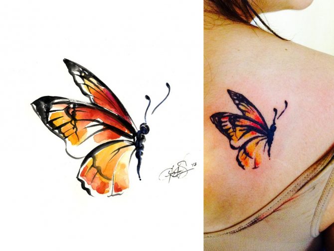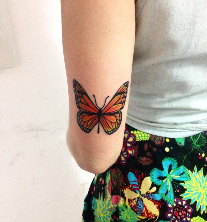 Un motif de papillon est placé de préférence sur l'avant-bras et la lame de l'avant-bras. Les maîtres doivent souvent mettre en œuvre des idées similaires. Par conséquent, en choisissant ces endroits pour créer un tatouage, vous n'avez pas à vous inquiéter des défauts d'apparence et de qualité du travail fini. Réaliste, le papillon multicolore, qui se trouve sur l'épaule ou l'omoplate, ne laissera certainement pas une fille inaperçue à la plage.