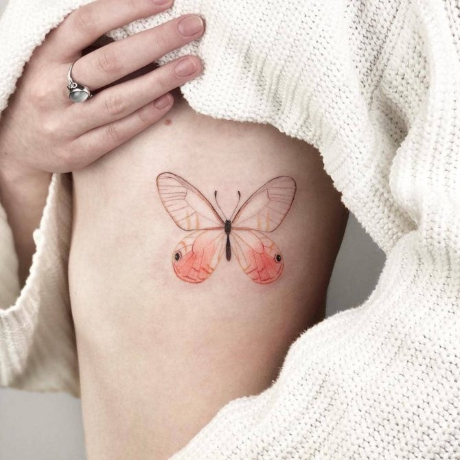 Quant au tatouage de papillon dans l'abdomen et les reins, dans ce cas, pour éviter l'aspect vulgaire permet de déplacer l'image sur un côté. Une telle solution fait allusion au romantisme de la nature féminine et vous permet de donner à la composition un aspect plutôt exotique.