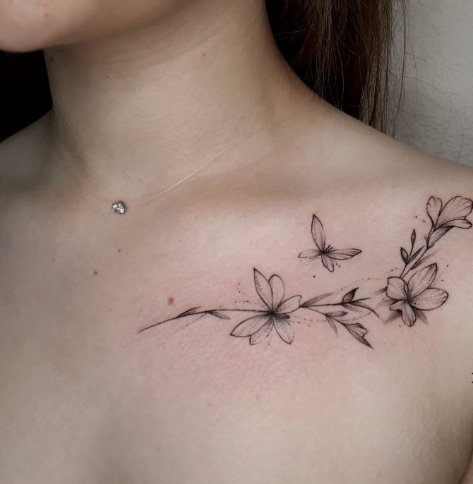 Souvent des papillons, les tatouages sur la jambe, le bras, le dos, d'autres zones sont complétés par des motifs ethniques, toutes sortes d'abstractions sous forme de dessins géométriques et de lignes courbes, de cœurs et d'étoiles, de motifs floraux. Tout cela vous permet de diversifier la composition et de la rendre plus originale par rapport à d'autres œuvres similaires.