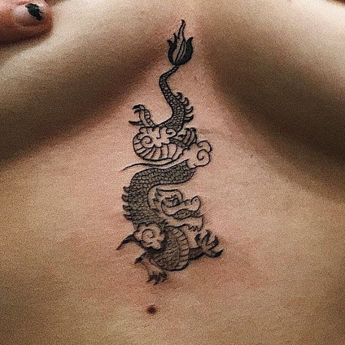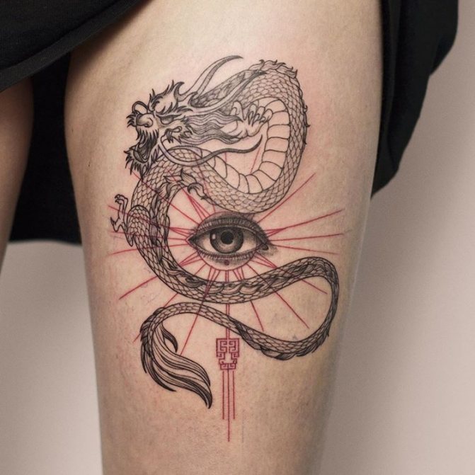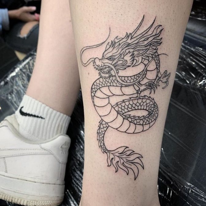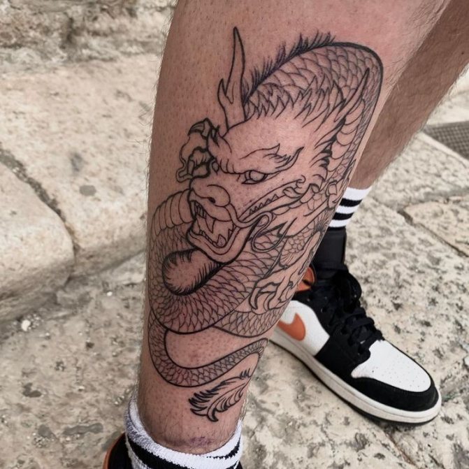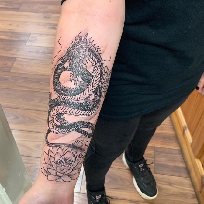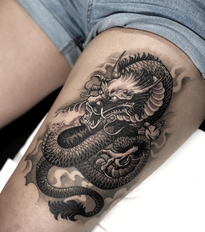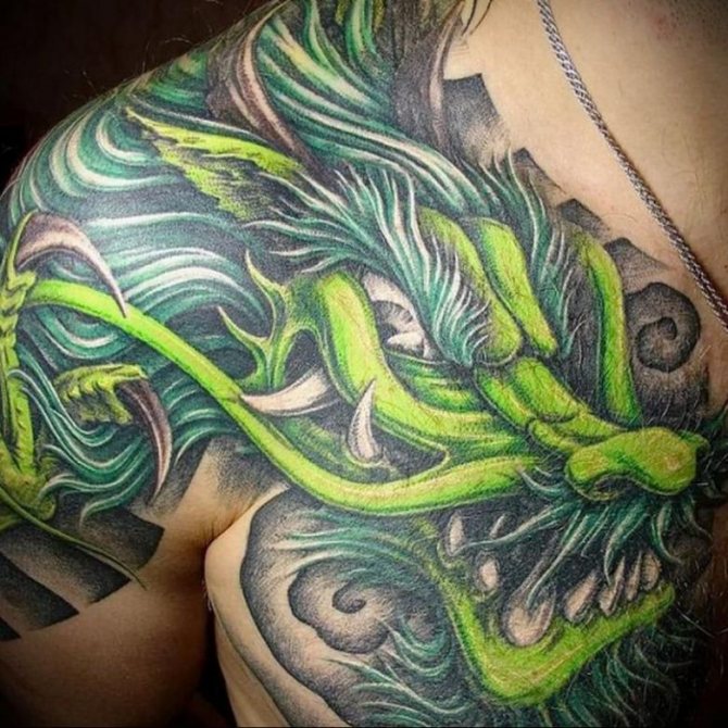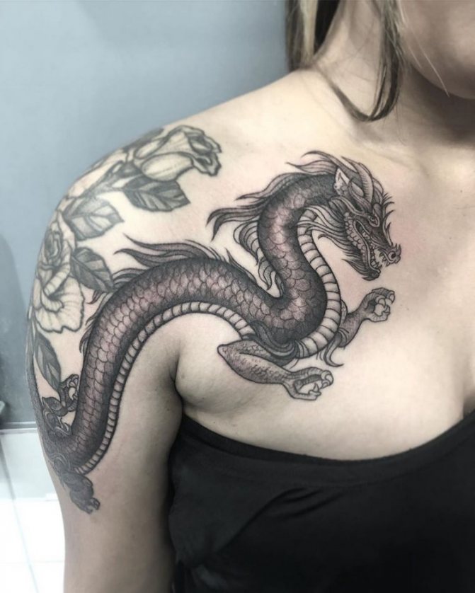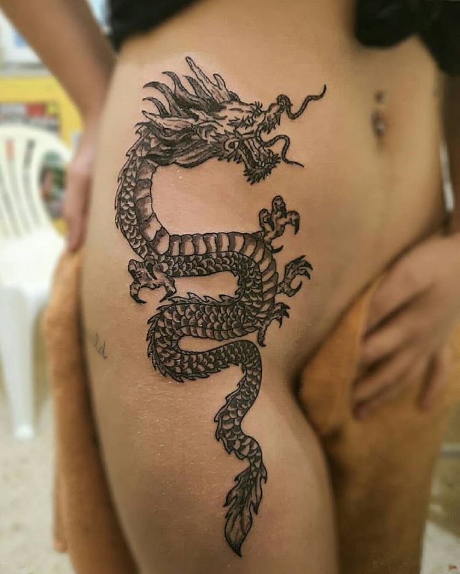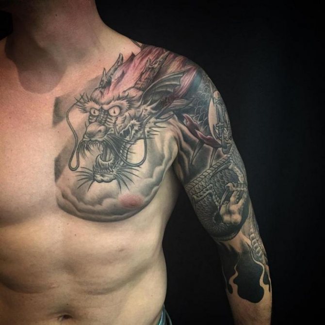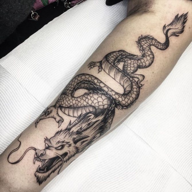 L'image du dragon apparaît dans le lore et les légendes de diverses nations, mais chaque nation la présente différemment. D'où la dualité des interprétations de la peinture corporelle représentant le reptile mythique. Depuis la fondation de l'État du Soleil Levant, les dragons japonais sont considérés comme des créatures sacrées, des protecteurs du pays et de la nation, et un symbole de puissance inébranlable. Pour cette raison, le tatouage de dragon sur les bras, la poitrine, l'abdomen, la taille et le dos de la mafia yakuza japonaise est devenu l'un des éléments obligatoires du signe distinctif traditionnel de pouvoir et de supériorité. En Chine, le dessin de ce lézard a également une signification nationale. Il a longtemps été considéré comme le saint patron sacré de la famille impériale régnante et comme un symbole de prospérité pour le pays. Dans ces pays, la puissante créature crachant du feu est encore vénérée à un niveau divin.