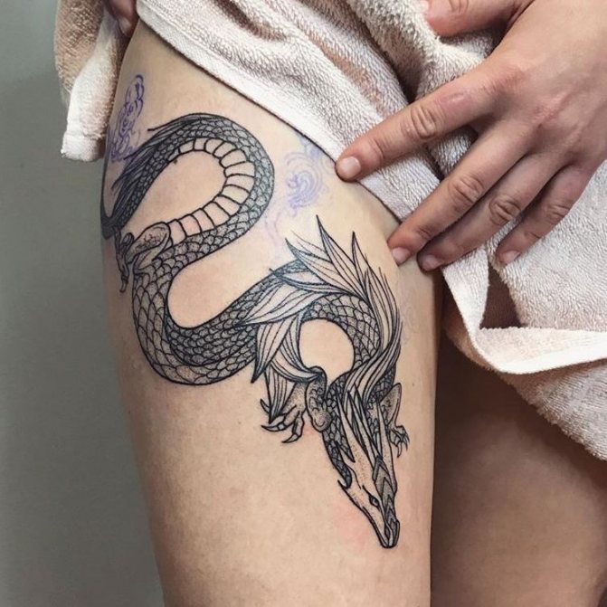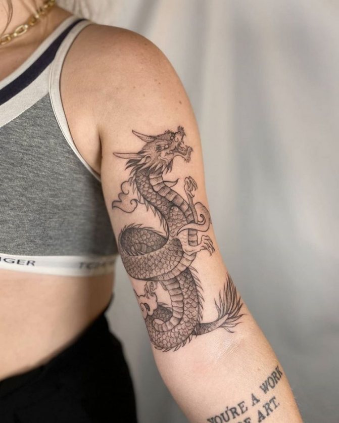 Les femmes montrent tout autant d'intérêt pour quelque chose comme ça. La signification "masculine" de ce que représente un tatouage de dragon s'étend en partie au féminin. La loyauté et le parrainage sont considérés comme faisant partie de la propre famille. Qu'il s'agisse d'un tatouage de manche de dragon ou d'un petit dessin sur le poignet, ces signes indiquent qu'une fille est une véritable gardienne de la maison. Elle est intelligente et attentionnée, mais si quelqu'un porte atteinte à ce qui est le plus sacré, sa colère sera terrible et destructrice pour les contrevenants.