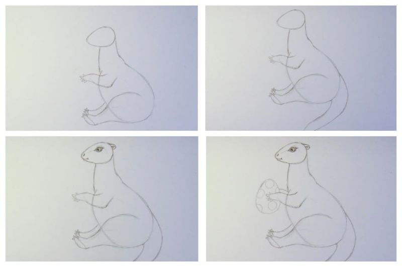- Sous le petit cercle, à une certaine distance, dessinez-en un autre, mais plus grand. Ce sera le torse. Utilisez des ovales pour tracer les jambes et la queue.