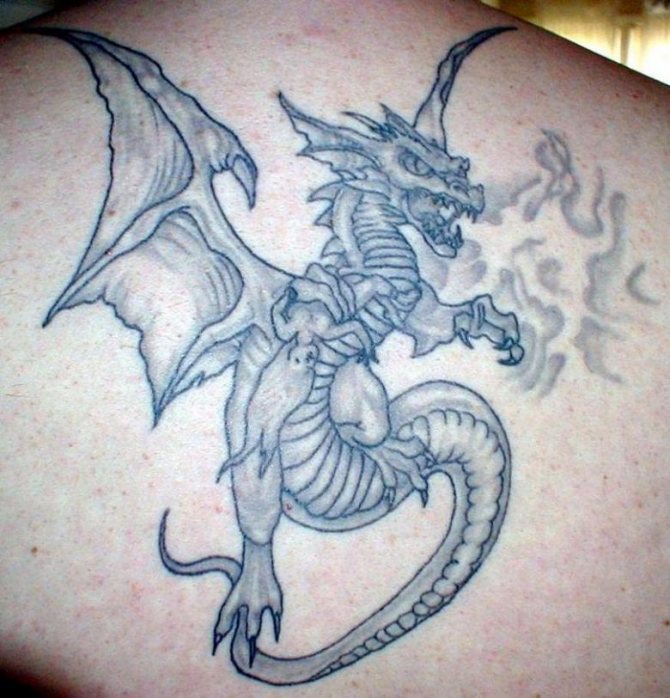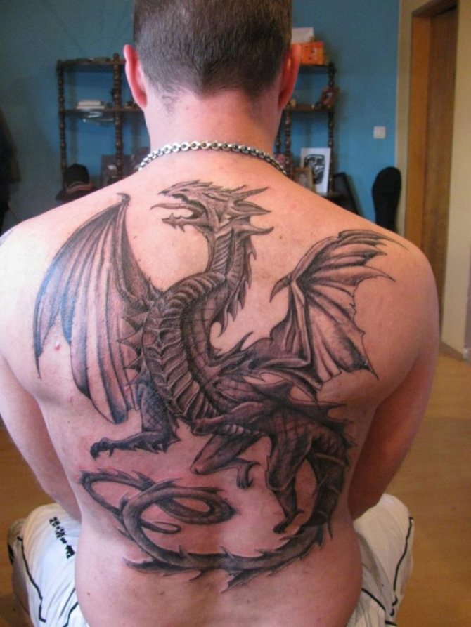 Les hommes aiment les grandes images, donc la zone ou l'endroit du tatouage choisir la poitrine, le dos, l'épaule ou l'avant-bras. Le dos est une option d'image favorable, vous permettant de refléter la puissance de cette créature mythique avec des détails incroyables.
