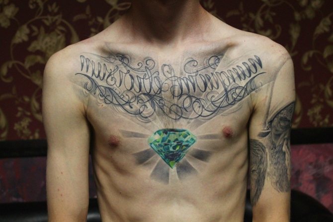 Les diamants peuvent être trouvés dans les tatouages comme un attribut supplémentaire. Un tatouage de couronne sertie de diamants signifiera le pouvoir, l'argent.
