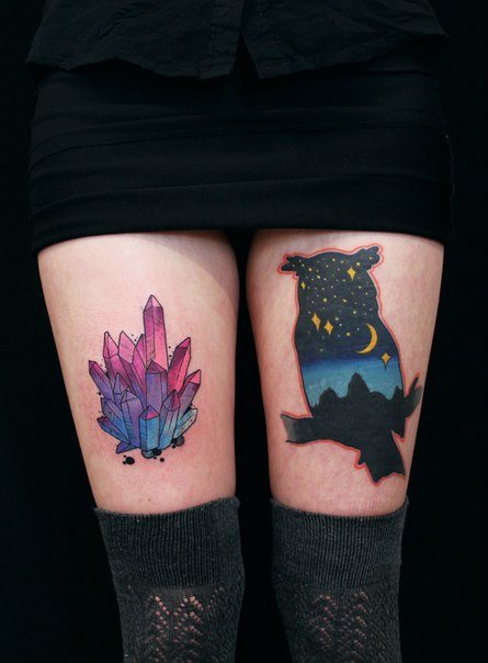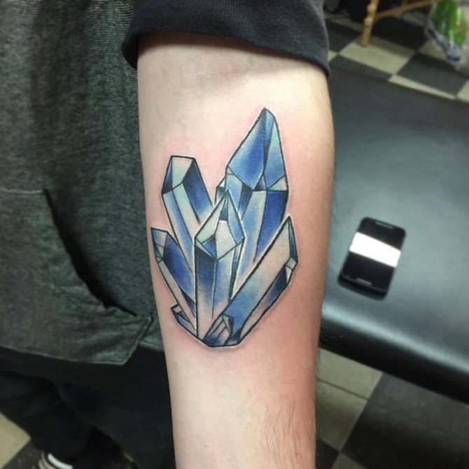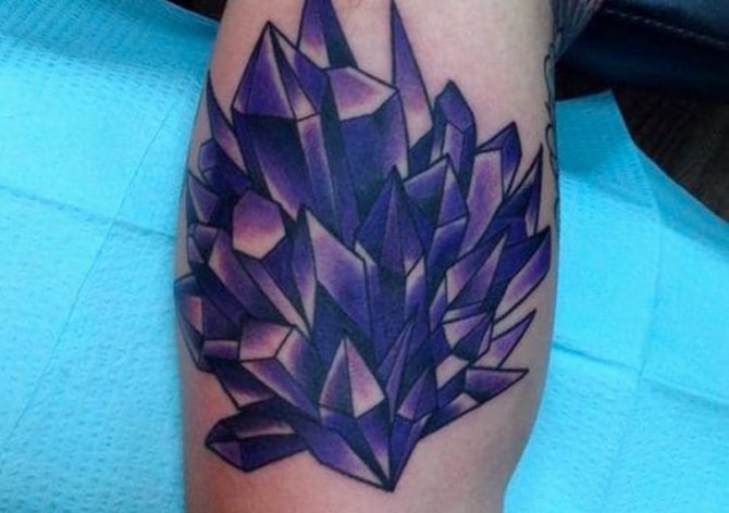 Quel est le meilleur endroit pour un tatouage en cristal ? Car dans la nature, ces formations peuvent avoir n'importe quelle taille, de quelques millimètres à quinze mètres. Donc, si vous voulez faire un tatouage d'un cristal sur votre main, ou même sur un doigt, réaliser une image réaliste ne sera pas difficile. Les structures cristallines sont bonnes car elles sont facilement modulables et ne présentent pas de proportions qui gâchent l'aspect du dessin lorsque vous le modifiez.