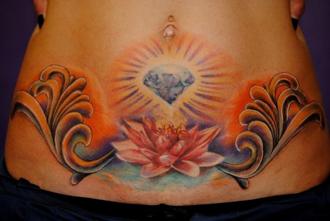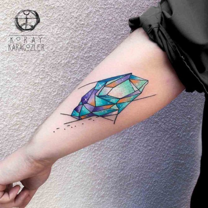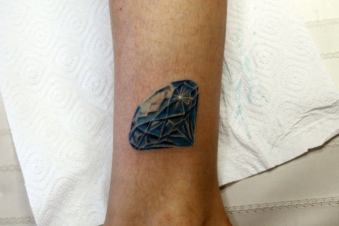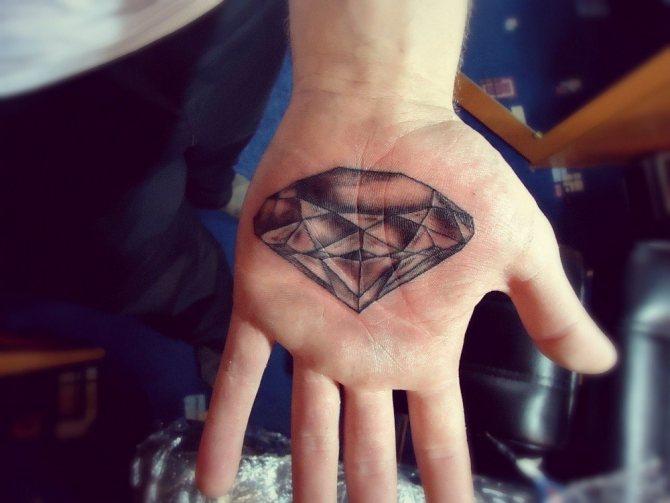 Un tatoueur compétent, en mélangeant les couleurs, accentuera toutes les facettes du diamant. La pierre peut être placée sur n'importe quelle partie du corps.
