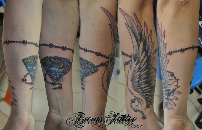 Les tatouages en forme de diamant sont souvent décorés d'ailes, de lunettes ou de fleurs. On trouve souvent un diamant avec des rayons de soleil - un tel tatouage est réalisé dans le but de renforcer l'action de la pierre, pour se protéger des accidents.