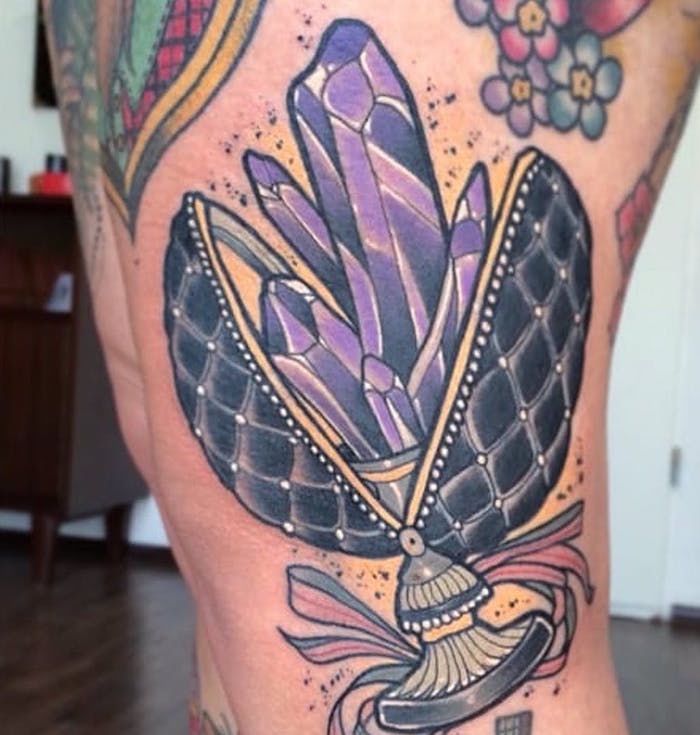. Le chakra représenté par l'améthyste est la couronne ou la zone violette. C'est le chakra le plus élevé et il est associé au cerveau ou à la réflexion. Un tatouage en améthyste représente le contrôle de l'esprit sur l'état mental, ainsi qu'un penchant pour la philosophie et l'apprentissage.
