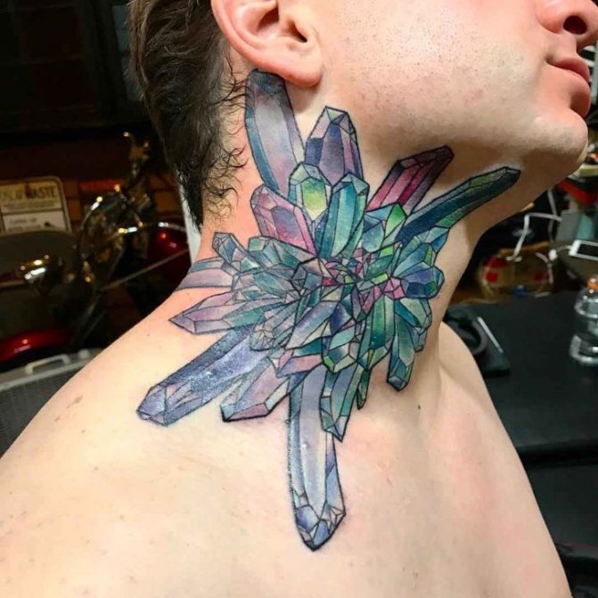 Le tatouage en cristal sur le cou est inhabituel mais magnifique. Il est préférable de le faire juste en dessous de la zone de pousse des poils (sur la face arrière). Vous pouvez faire un grand dessin sur votre dos montrant une partie d'une grotte avec des cristaux poussant à l'intérieur dans de grands drus.