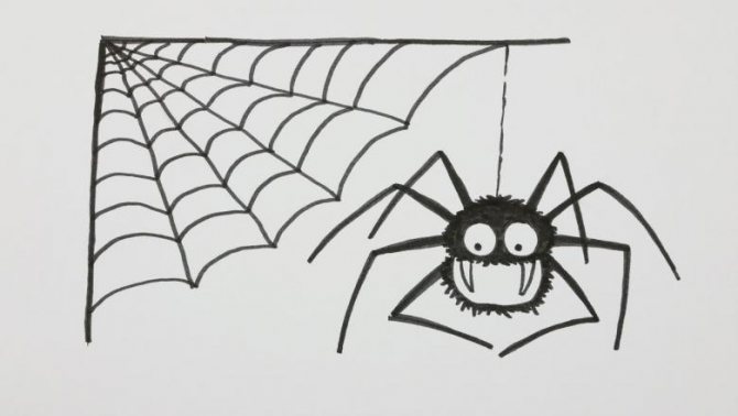 - À partir d'une des lignes, tu peux tracer une autre ligne droite vers le bas et au bout de celle-ci, tu peux dessiner une jolie araignée en forme de cercle avec des yeux rouges et 6 pattes.