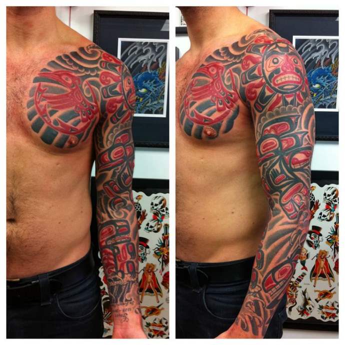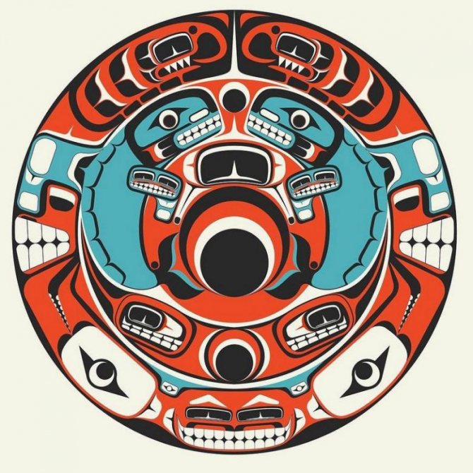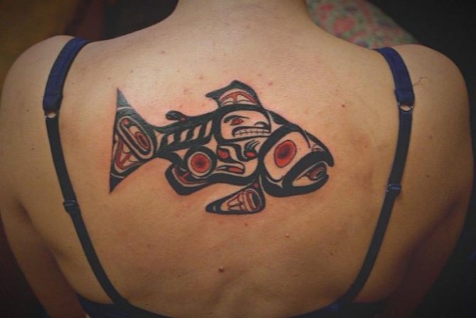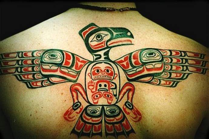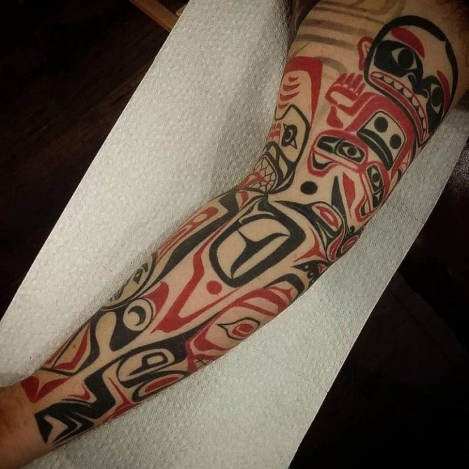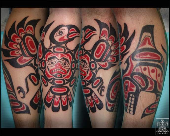Les principales couleurs de ce style sont le noir, le rouge et le bleu. C'est une sorte de drapeau. Chaque couleur a sa propre signification - élément. Les Haïdas utilisent principalement le noir et le rouge, les Tlingits le noir, le bleu et le jaune, et d'autres nations ont également des couleurs légèrement différentes. Le principal est toujours noir. Le noir et le rouge vont bien aux tatouages. Et dans le passé, les peintures pour tatouages n'étaient pas aussi riches en palette, ce qui fait que ces couleurs ont particulièrement accroché.