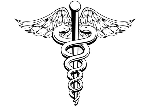 Son symbole est également considéré comme un bâton d'Asclépios. Il est parfois associé au caducée. Le bâton d'Asclepius est une tige de bois enroulée dans un serpent. Son histoire trouve également ses racines dans la mythologie grecque, mais elle n'a rien à voir avec le caducée.