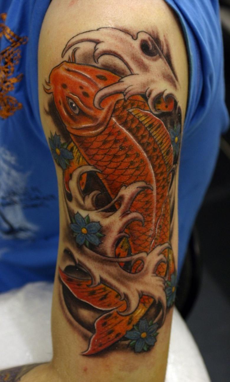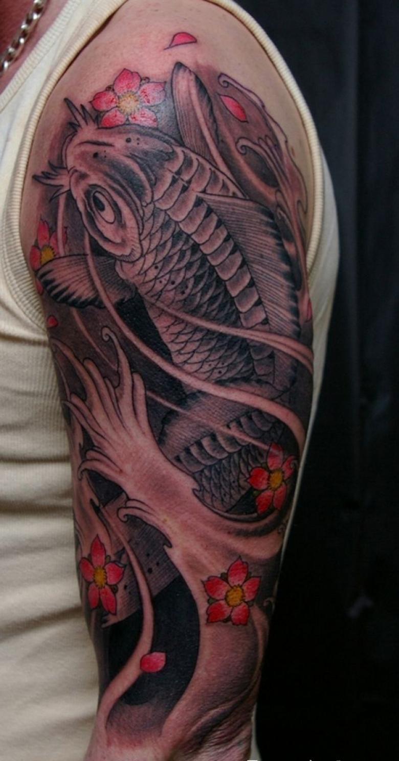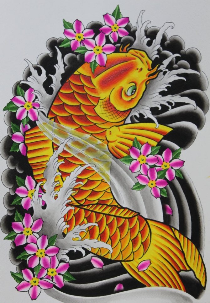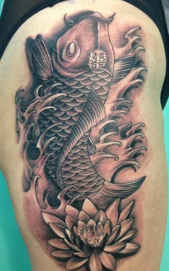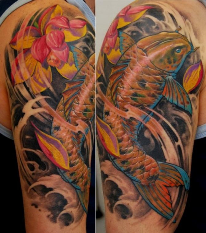 La philosophie orientale occupe une place particulière parmi les tatouages. Au même titre que les dragons, les tigres et les lotus, l'une des espèces les plus populaires est la carpe koï. Autrefois un poisson gris et discret, il est devenu le roi des rivières. Aujourd'hui, on peut trouver toutes sortes de couleurs. La carpe est célèbre pour sa soif de vie, sa lutte pour la survie. Afin d'avoir une progéniture, ce poisson parcourt un long et difficile chemin à contre-courant, et saute par-dessus des chutes d'eau.