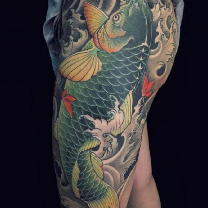 Le tatouage de carpe le plus courant est un dessin de poisson japonais. En japonais, carpe ressemble à koi. Le koi est très important dans la philosophie orientale. La culture nationale chinoise reconnaît ce brave poisson comme un empereur parmi tous les autres. Un autre nom très célèbre est celui de poisson-dragon. Une légende bien connue raconte qu'une petite carpe a surmonté le fort courant de la Huanghe. Il a atteint la porte du dragon, qui était située à l'embouchure du fleuve jaune. En récompense, il s'est lui-même transformé en dragon. Moralité - l'assiduité et les efforts fournis par un travail acharné permettront d'atteindre les hauteurs souhaitées.