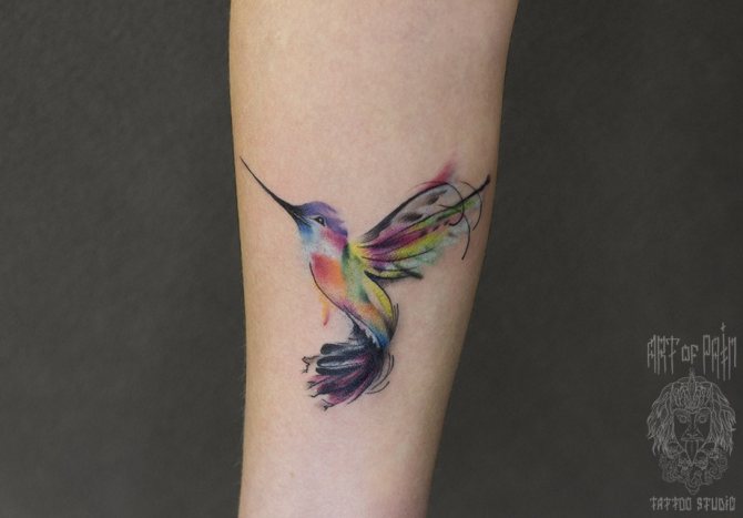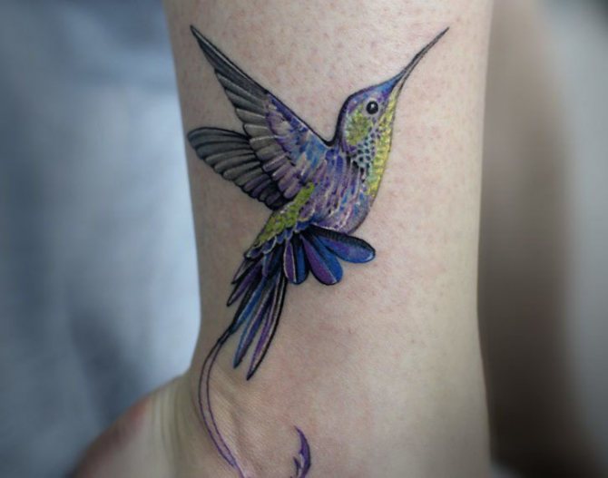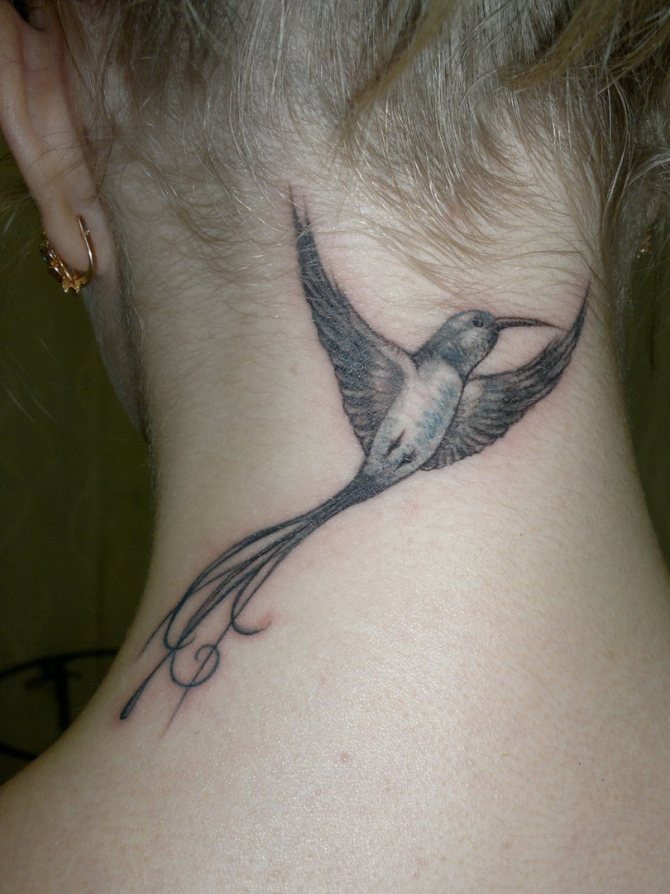 L'un des tatouages d'oiseau les plus populaires est considéré comme un colibri. Il se distingue par sa beauté et sa grâce. La signification principale du tatouage avec ce petit oiseau charmant est l'amour et la joie de vivre, la gaieté de son propriétaire. Comme pour la plupart des tatouages d'oiseaux, les colibris ont un sous-entendu d'aspiration à la liberté et à l'indépendance. Faites le tatouage sur l'épaule, l'avant-bras, le dos et d'autres parties du corps. L'art corporel, beau et à la mode, peut être réalisé en noir et blanc ou en couleur. Le contour peut également être tracé dans une couleur spécifique.